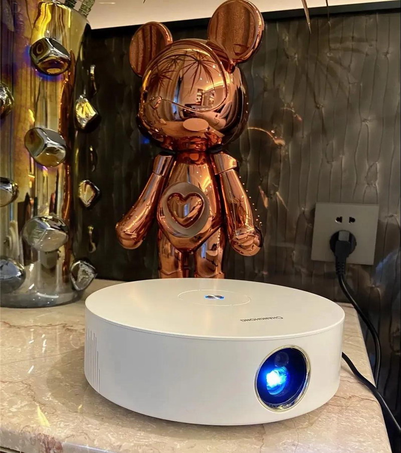 長虹S2 Pro智能投影儀,以圓潤的棋子為造型,并去繁存簡,只在頂面設置了金屬開關鍵;開機時,開關鍵下的藍色指示燈與正面鏡頭中的藍光相呼應,不破壞機身整體白色的簡約和浪漫。選擇小巧的S2 Pro,為你和Ta的家,添一抹精致的風景。
