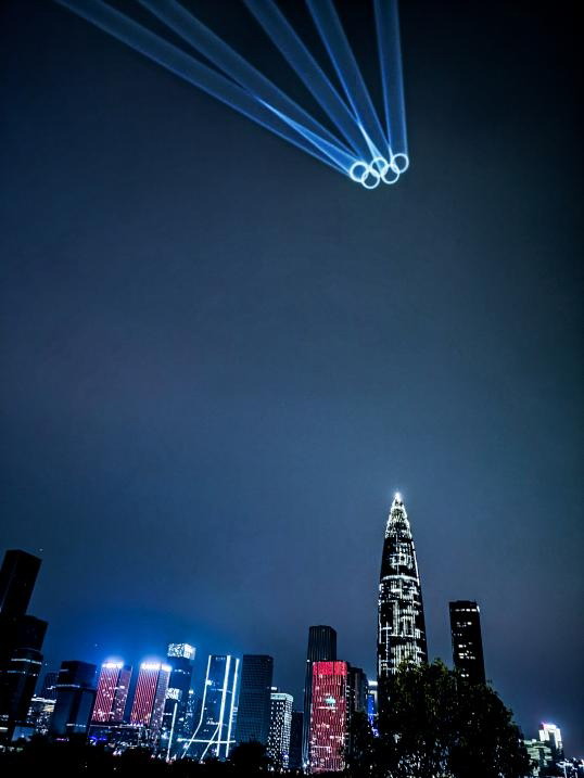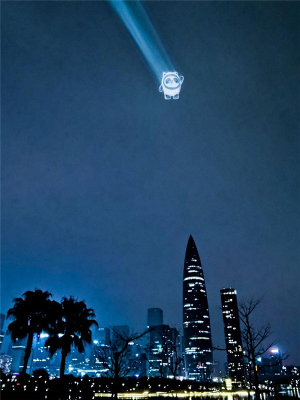 與燈火交相輝映、以高樓群峰聳立的“中國硅谷”——深圳科技園為背景,在高空中閃耀出現“冰墩墩”、“同心抗疫,歡慶元宵”、“深愛人才、圳等您來”、“奧運五環”、“一起向未來”的字樣和圖形,將元宵團圓的氛圍推向了最高峰。