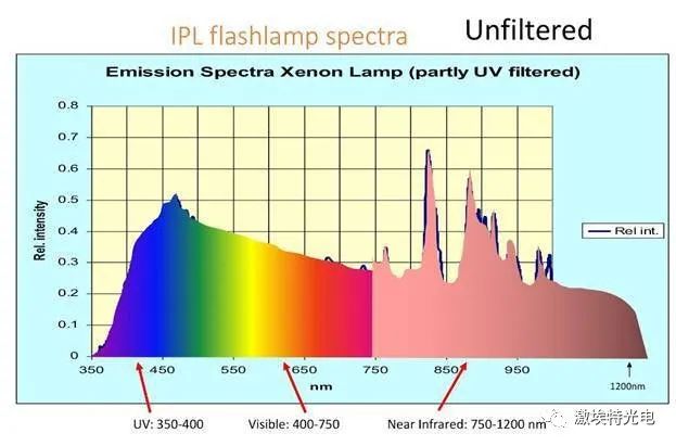 脈沖氙燈的波長范圍很廣,光譜在160~2000nm均有分布,中心峰值是480nm至800nm;