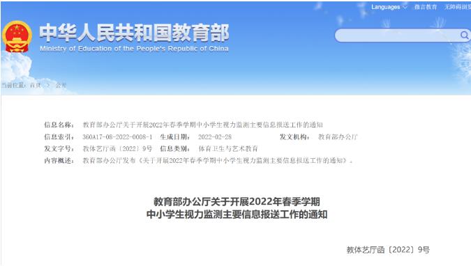 通知指出:各地教育部門和中小學校要落實《教育部辦公廳關于做好中小學生定期視力監測主要信息報送工作的通知》(教體藝廳函〔2021〕26號)要求,近20萬所中小學校按時報送了2021年秋季學期中小學生視力監測主要信息。為深入貫徹落實習近平總書記關于兒童青少年近視防控系列重要指示批示精神,進一步落實《綜合防控兒童青少年近視實施方案》(教體藝〔2018〕3號)、《兒童青少年近視防控光明行動工作方案(2021—2025年)》(教體藝廳函〔2021〕19號)。