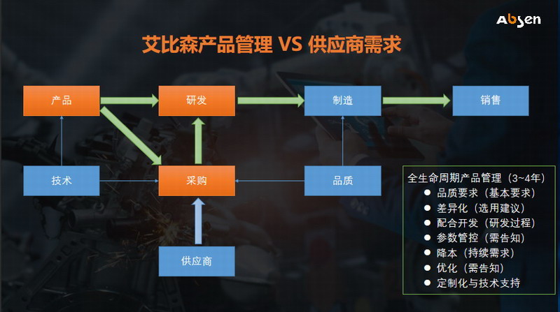產(chǎn)品、研發(fā)、采購三位一體,艾比森一直致力于與供應商伙伴共同構(gòu)建一個緊密聯(lián)系、獨具優(yōu)勢的供應鏈組織。會上,艾比森戰(zhàn)略營銷體系副總經(jīng)理、產(chǎn)品開發(fā)體系總經(jīng)理、戰(zhàn)略采購部總監(jiān)分別從艾比森產(chǎn)品管理與八大標準、IPD產(chǎn)品開發(fā)流程、供應鏈管理等維度分析合作供應商如何參與艾比森的產(chǎn)品規(guī)劃、產(chǎn)品開發(fā)過程,在深度合作中全面協(xié)同發(fā)展,促進能力提升,真正實現(xiàn)共贏。