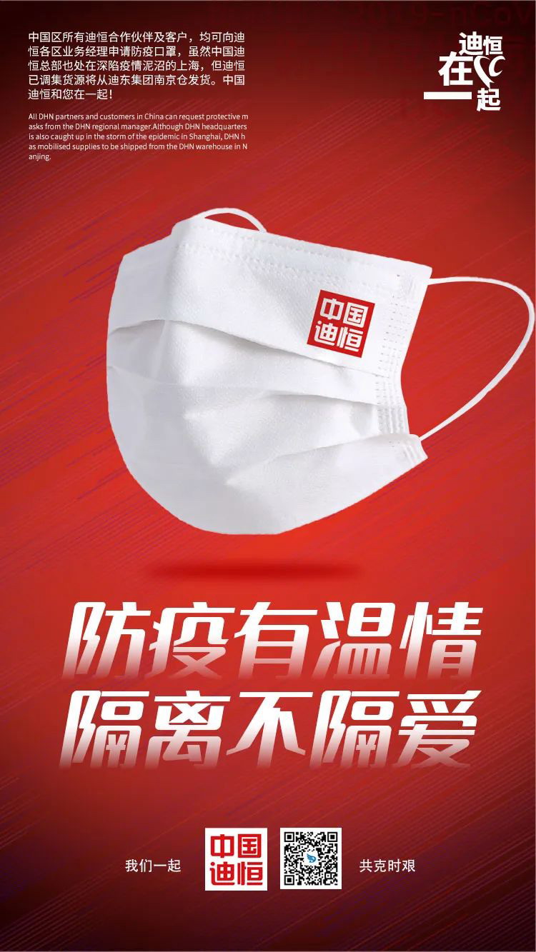 防疫有溫情,隔離不隔愛。戴口罩是阻斷呼吸道分泌物傳播的有效手段,迪恒在疫情期間管理好內部之外,也要為防御疫情獻出一份微薄之力。中國區所有迪恒合作伙伴及客戶,均可向迪恒各區業務經理申請防疫口罩,雖然中國迪恒總部也處在深陷疫情泥沼的上海,但迪恒已調集貨源將從迪東集團南京倉發貨。中國迪恒,與您同在。