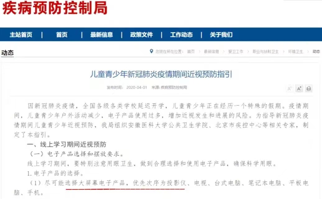 為預防近視,衛健委指出:盡可能選擇大屏幕電子產品,優先次序依次中投影儀位居首。