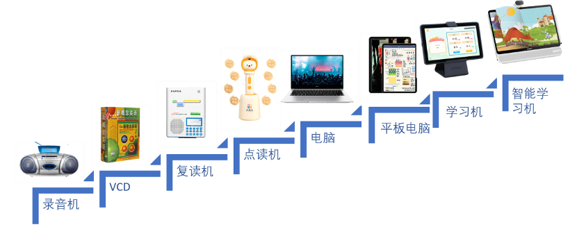 開篇先來波暴露年齡的回憶殺,70后-10后不同年代的學習終端有:錄音機(英語磁帶)、VCD(英語光盤)、復讀機、點讀機、電腦、平板電腦、平板學習機等,花樣年華時期的你,用過哪種形態的學習終端?