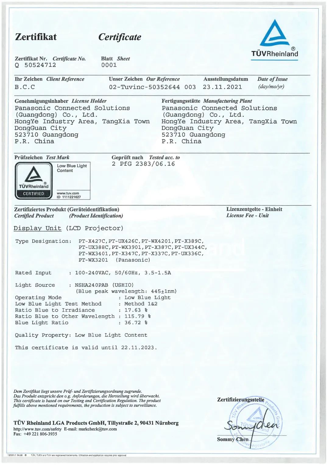 為了有效減少藍光對視力的損害,松下推出“藍光減少模式”短焦/UX/X系列投影機,并獲得德國萊茵TüV低藍光認證。將投影機調至藍光減少模式時,在保證投影機畫面質量的同時,可智能調節,有效抑制藍光輸出,以達到保護視力的效果。