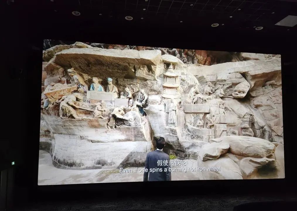 觀眾置身舒適的影院,衣冠玲瓏、氣度嫻雅的石像濃墨重彩地出現在球幕之上,或坐或臥,或獨或群,一龕龕美的造像近在咫尺,細膩逼真的石刻仿佛穿越千年向我們走來,隨著畫面的推拉搖移,觀眾跟隨畫面進入大足石刻開鑿的歷史長卷,中國石窟藝術的巔峰在球幕上舒展綻放。