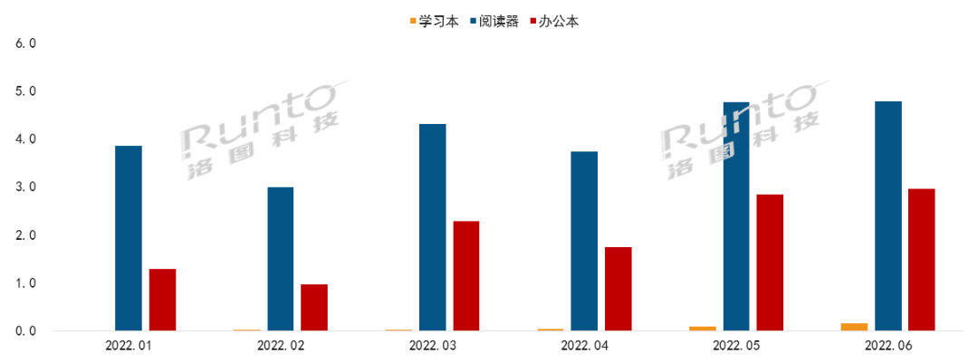 從細分產品來看,6月電子紙閱讀器線上銷量為4.8萬臺,環比5月僅上漲0.3%;電子紙辦公本線上銷量為3萬臺,環比5月上漲4%;電子紙學習本線上銷量為0.2萬臺,環比5月上漲102%。
