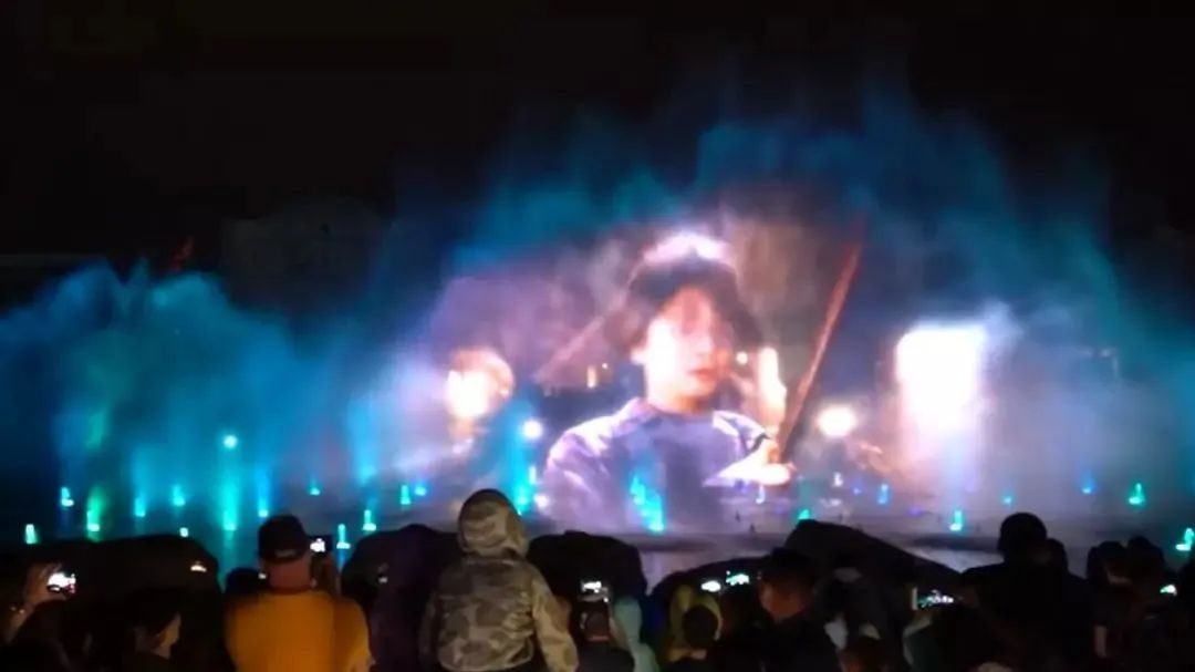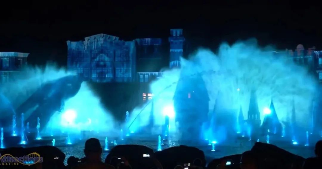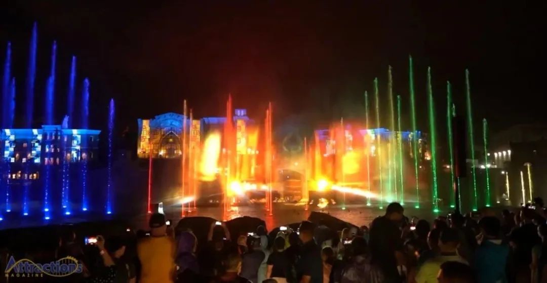 大量哈利波特粉絲聚集在現場觀看,驚艷的煙花和神奇的水芭蕾相互輝映,電影開始展開,讓人驚嘆。一幕幕經典片段借用光與影,水與霧重新再現,哈利騎著巴克比克在水中出現,鳳凰福克斯飛向鄧布利多……最后代表四學院顏色的水柱噴出,為現場的游客帶來了一場別樣水秀表演。