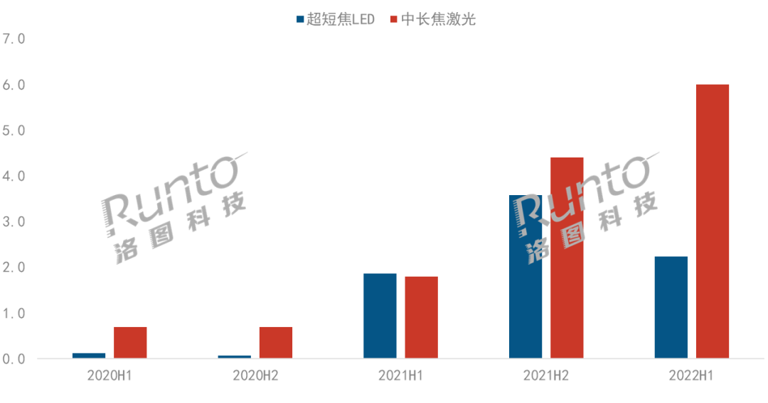 同時,1.5到2K之間的產(chǎn)品向2K以上遷移。2022年上半年,2K流明以上的市場份額為11.7%,較去年上半年增長2.0個百分點。一方面得益于歐司朗光源技術(shù)的突破,眾多2K流明以上的旗艦LED產(chǎn)品問世;另一方面則是由于中長焦激光產(chǎn)品的上量。