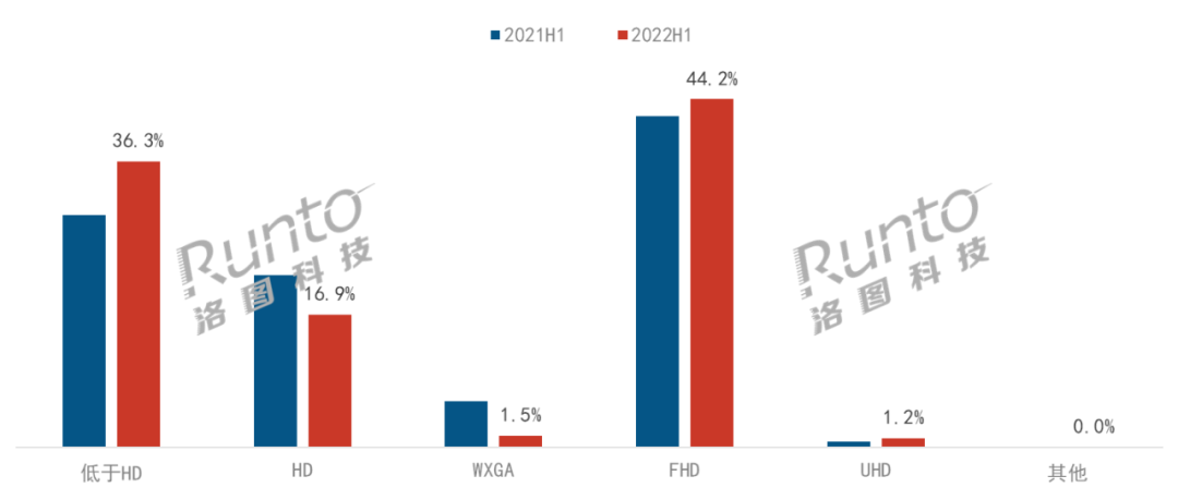FHD已成為主銷分辨率,根據(jù)洛圖科技(RUNTO)線上數(shù)據(jù)顯示,2022年上半年,F(xiàn)HD份額達到44.2%,較去年同期增長2.2個百分點。