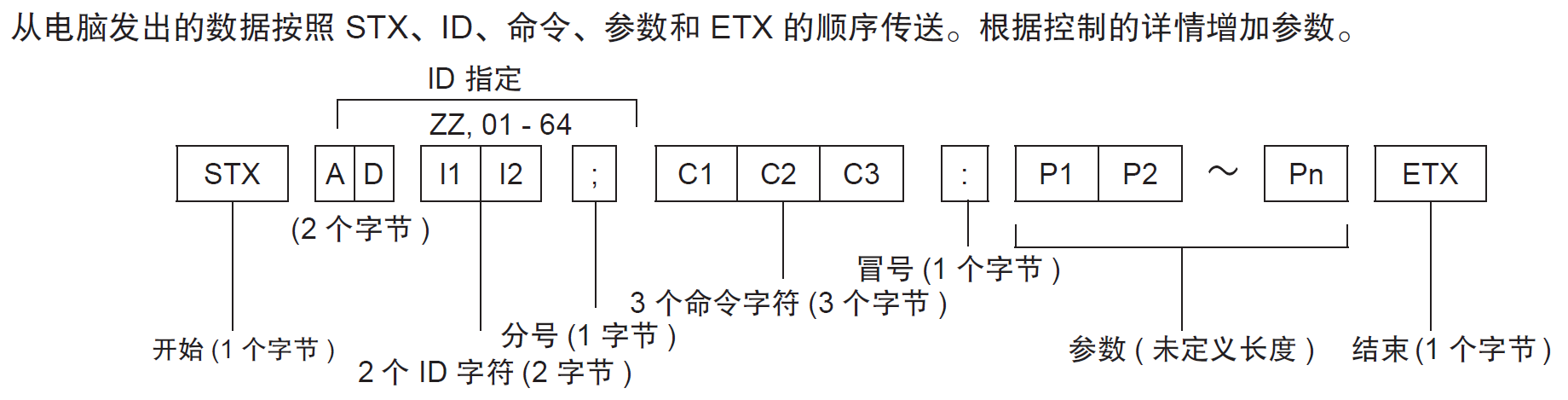 ✔按照STX、ID、命令、參數(shù)、ETX的命令格式,串口指令應(yīng)為:STX PON ETX
