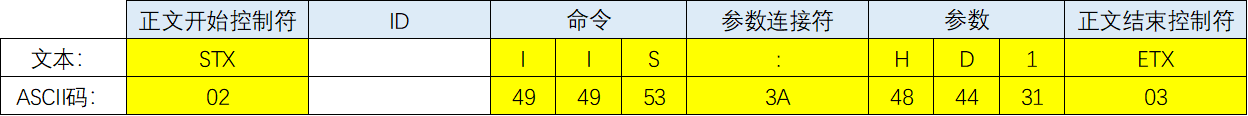 ✔按照STX、ID、命令、參數(shù)、ETX的命令格式,串口指令應(yīng)為:STX IIS : HD1 ETX