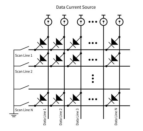 這種PM逐點掃描方式,較容易實現,PCB設計布線比較繁瑣,并且LED是循環高速掃描點亮,點亮時間非常短,所以亮度效率低,其次由于大量的掃描電路的設計,采用了大量的阻容器件,導致LED像素間串擾明顯,對掃描信號的頻率要求很高,這其實對驅動技術也提出了挑戰,已經不能滿足Micro LED在中小尺寸高解析度屏幕的應用。