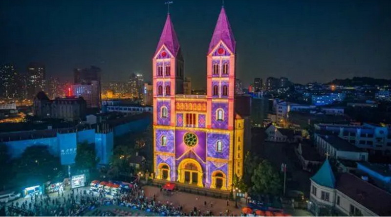 燈光秀不僅讓天主教老教堂煥發新的魅力,也給歷史街區的夜游經濟帶來新生的活力。里院建筑是青島地域性傳統民居的典型代表。市政府曾將老街區改造列為重點發展項目之一,依托歷史里院,開發集文化、旅游、娛樂、餐飲為主體的具有老街坊特色的休閑經濟和文化住宅,并依托這些更新改造后的區域,舉辦城市啤酒節、新春燈會等活躍人們文化生活的重大活動。教堂燈光秀無疑在每一個重要時刻,都會成為最吸引流量的、最靚麗的那道風景。