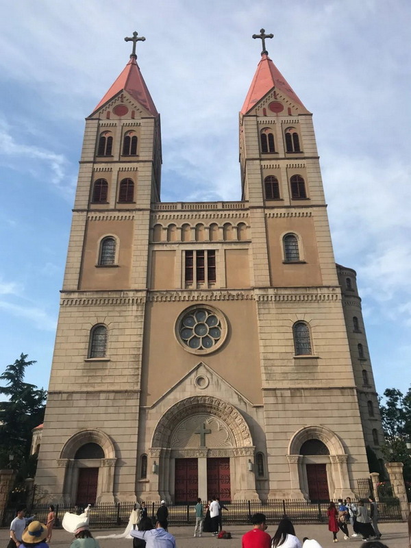 這就是位于青島老城區的天主教圣彌厄爾大教堂,中國唯一的祝圣教堂,整體建筑面積為3223.58平方米,共占地約2470平方米,位于青島歷史悠久的“里院”老街區附近。教堂為磚石雙塔建筑,兩座鐘樓塔身高56米,頂尖各豎有4.5米高,1噸多重的大十字架, 在相當長的時間里雙塔聳立的宏偉教堂曾經是青島最高的建筑,是青島城市輪廓線的重要組成部分。