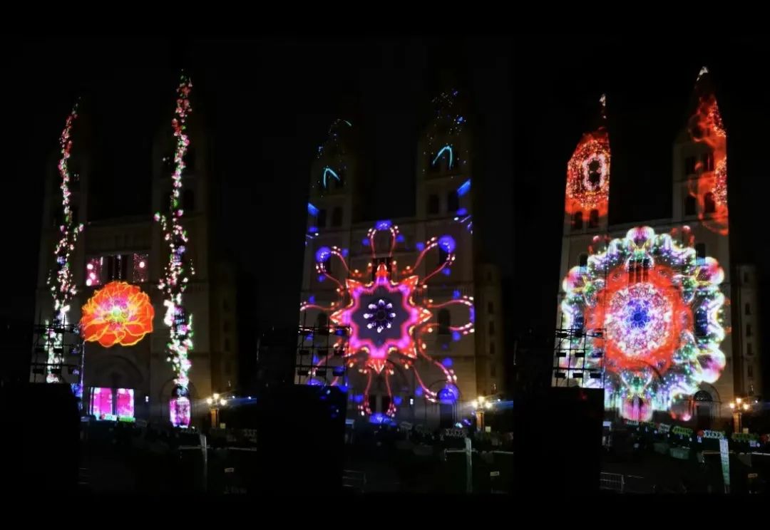 教堂燈光秀在哥特式和羅曼式建筑折衷的巨大樓體上演,采用圖像產業領導者DP公司的高端投影設備,運用先進的投影拼接技術,完成大面積投影與界面的精準融合,在復雜空間物體上實現動態影像的立體顯示。
