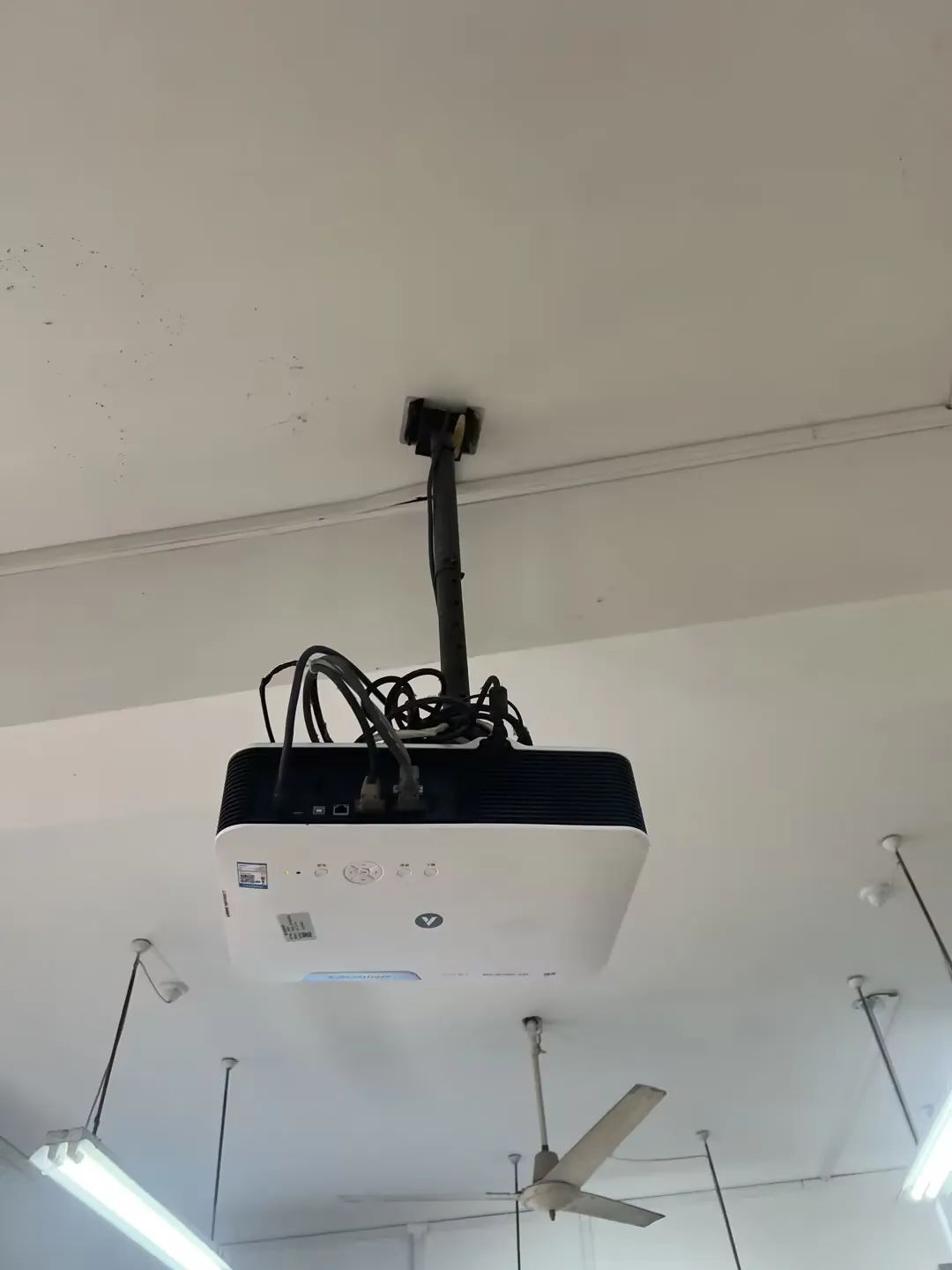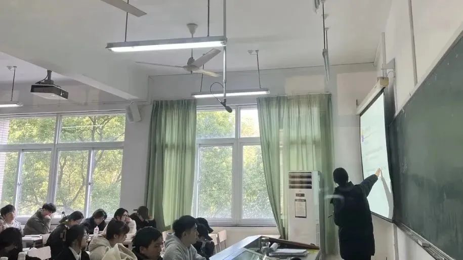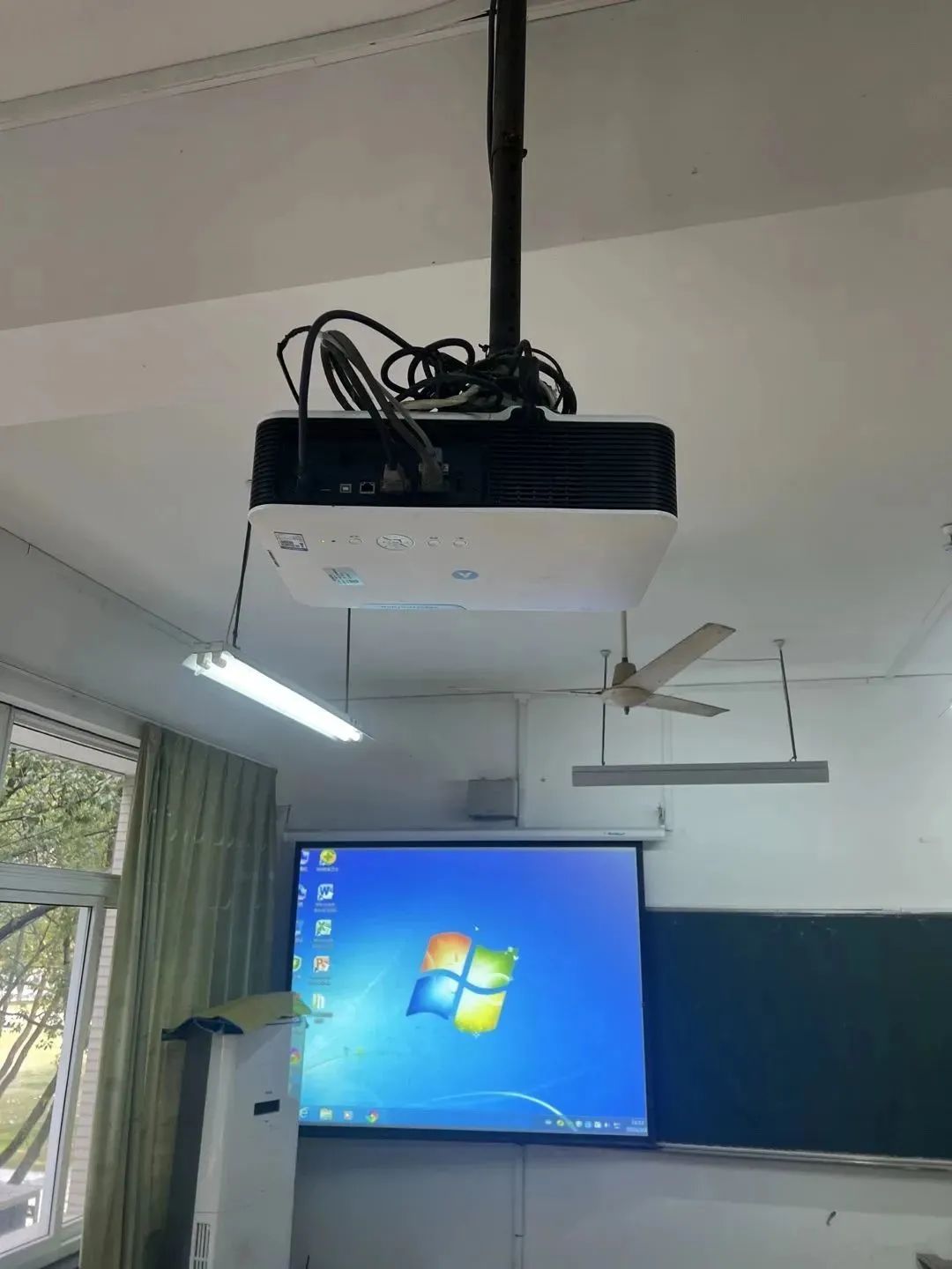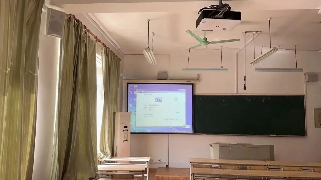 1臺投影機搭配1塊120吋的電動拉線幕布、吊麥等智能化產品,輔以傳統黑板,彌補了傳統黑板教學形式單調的缺陷,豐富了教學內容,讓知識得以更直觀化、具象化的展現,是高校將傳統教室升級改建為現代化的多媒體教室,極具性價比的解決方案。