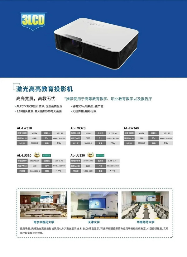 激光長焦高亮投影機可實現最大300吋的投影大畫面,保障高校100-200人的教室里所有學生看清投影內容,擁有大畫面課堂體驗。