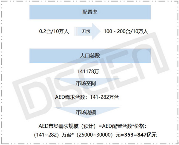 由此可見, AED需求將在公共場所持續爆發,據國家衛健委《公共場所自動體外除顫器配置及管理技術指南(征求意見稿)》文件標準,AED配置數量應達到100-200臺/10萬人,以我國141178萬的人口總量進行測算,未來10年AED配置數應達到141-282萬臺,市場規模將達到百億規模。