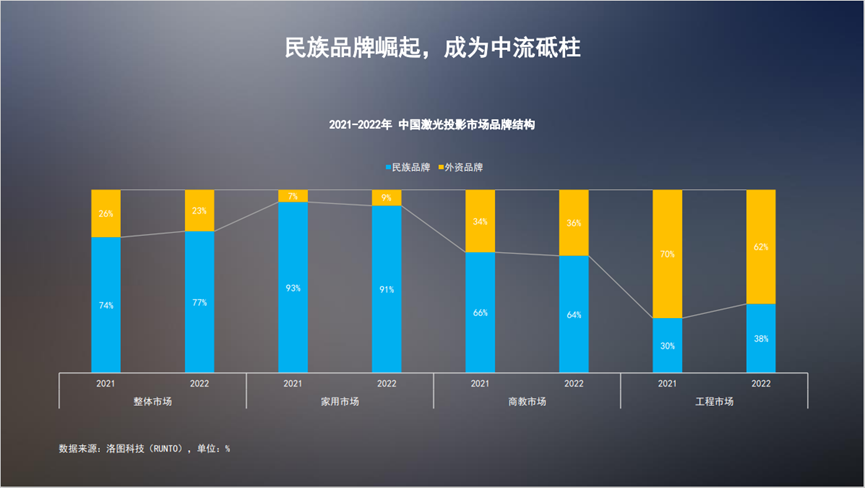 民族品牌崛起,成為激光投影市場的中流砥柱。根據洛圖科技(RUNTO)數據顯示,2022年民族品牌在中國激光投影市場中的出貨量占比已經達到77%,其中家用市場民族品牌持續主導,份額超九成;工程市場中,民族品牌份額從2021年的30%增長至2022年的38%。
