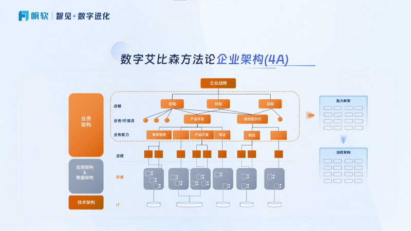 價值流清楚了以后,我們就非常清楚從價值流導出我們需要什么樣的業務能力,也就是能力框架,基于能力框架,下一步是要去做系統應用,中間就需要把能力框架轉化成流程框架,因為我們需要通過流程來承載你的業務能力,然后再去通過應用系統承載我們的流程,在應用系統之內需要去做的是數據的結構化,是數據的架構。在最底層有一個基礎的技術架構來承接,這才是一個完完整整的從企業經營到數字化建設的過程。