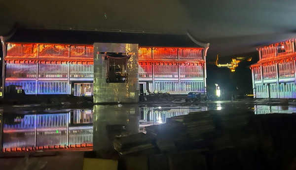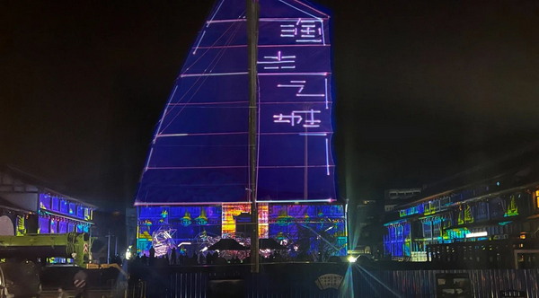 贏康為演出場地的三面樓閣建筑以及現場的船帆雕塑進行了投影方案設計以及現場施工調試等工作。