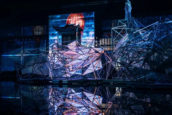 同時,三座樓閣也配合著演出的進行不斷變換投影畫面,這正好與中央的水面舞臺構成了一個全場景360度全感官的沉浸式演出空間。