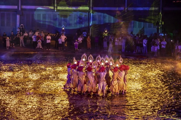 演出在由三座樓閣包圍的露天舞臺進行,以“漁夫撒網”為開端,演員們陸續根據演出情節進場,身著漁夫、海女的裝扮,手持燈籠、魚簍,在波光粼粼好似變幻莫測的大海的水面舞臺上,翩然起舞。