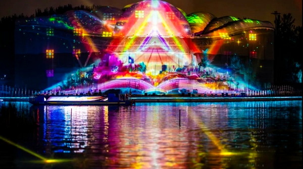 坐落于朝陽公園中心島的貝殼劇場,是亮馬河水上游船線路的特色節點。白天,它靜若湖中的一顆珍珠;夜晚,則化身為奇幻的視覺盛宴。燈光節期間,3臺巴可UDX系列投影機呈現“潮涌萬象”光影秀,將這座建筑變為“光影魔方”,從宇宙的深邃到自然的生機,光影變幻交織,展現了朝陽區的蓬勃活力和多樣魅力,傳遞出“生生不息、萬象更新”的美好意境。