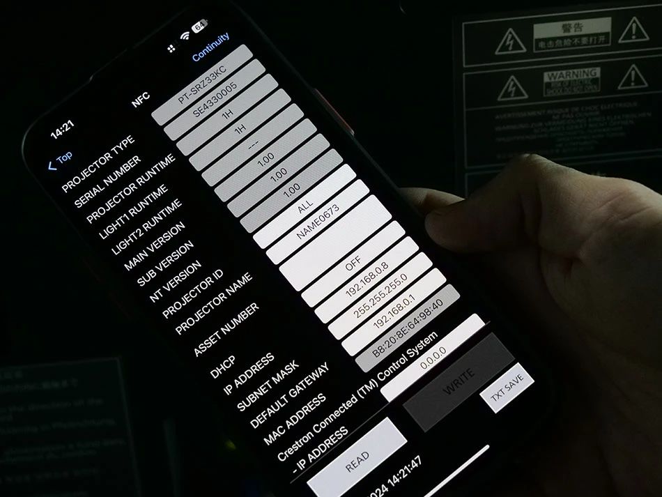 PT-SRZ33KC的NFC功能非常有特色,把手機靠近投影機,在沒接通電源的情況下就能通過NFC讀取和修改投影機的ID和IP地址。在復雜的大中型項目中,通常有多臺投影機,整個配置過程簡單快捷,能大大減少了現場調試的時間。