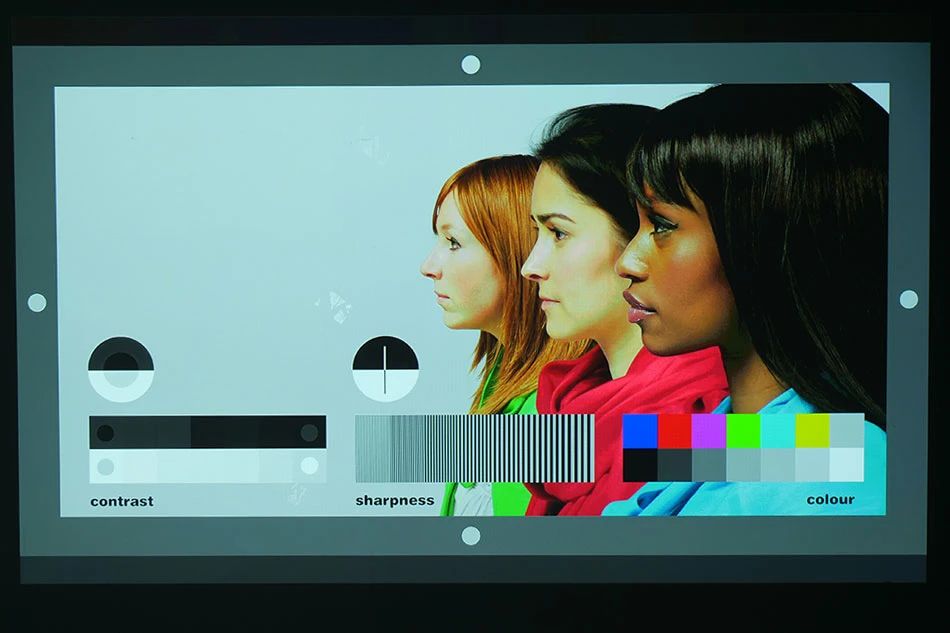 幾何校正測試中,投射畫面四角保持完美的直角,亮度分布均勻到位。圓圈內色階過渡自然流暢。