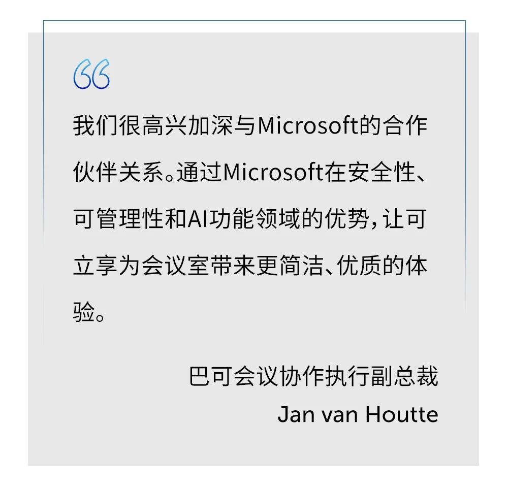 巴可宣布未來可立享解決方案將使用Microsoft設備生態系統平臺開發,通過該系統安全與IT友好的企業級功能,打造更直觀、公平的混合會議解決方案。