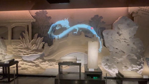 為增加展區(qū)趣味性、故事性,北京大運(yùn)河博物館在石刻園林展示區(qū)還采用新穎投影機(jī)軌道鏡解決方案,利用單臺(tái)空靈系列搭載軌道鏡系統(tǒng),讓靈龍、石獅在兩側(cè)石刻上活靈活現(xiàn)地舞動(dòng)、跳躍,實(shí)現(xiàn)投影一小“動(dòng)”,創(chuàng)意畫面一大“動(dòng)”。