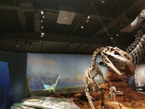 走近自然地理展區(qū),多臺(tái)PX803UL-BK+激光投影機(jī)融合打造的全息紗幕投影映入眼簾,亦真亦幻的遠(yuǎn)古地貌,栩栩如生的光影恐龍,帶領(lǐng)觀眾穿越到白堊紀(jì)時(shí)期,感受數(shù)千萬年前株洲大地的勃勃生機(jī)。移步歷史文物展廳,PX803UL-BK+以異形雕塑投影的方式,在火焰雕塑上勾勒出株洲的前世今生;PA803UL+以實(shí)物光雕投影的方式,再現(xiàn)2000多年前楚國軍卒手持吳戈征戰(zhàn)、護(hù)衛(wèi)邊疆的戰(zhàn)爭情景。民俗文物展區(qū)內(nèi),兩臺(tái)PX803UL-BK+通過雙機(jī)背投的方式,在全息透明幕上打造的畫卷式投影,勾勒出漁民泛舟江上、農(nóng)民下田勞作的生活畫卷,引領(lǐng)觀眾置身江南風(fēng)光,領(lǐng)略湘東風(fēng)物。