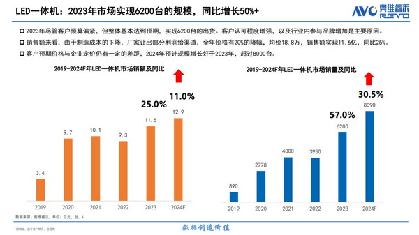 AVC Revo數據顯示,中國大陸2023年LED一體機市場的出貨量超過了5000臺,實現6200臺的規模,同比增長50%+。預計到2024年底市場規模增長優于2023年,有望超過8000臺。