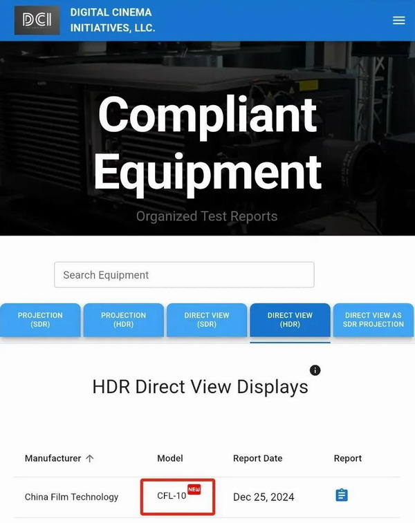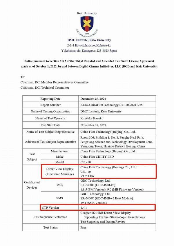 圖為中影CINITY LED通過DCI CTP1.4.1認證公告