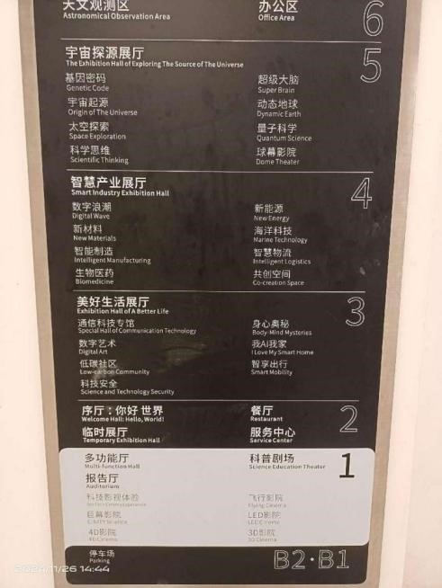 1樓多功能廳,2樓序廳,3樓美好生活展廳,4樓智慧產業展廳,5樓宇宙探索展廳,6樓天文觀測區