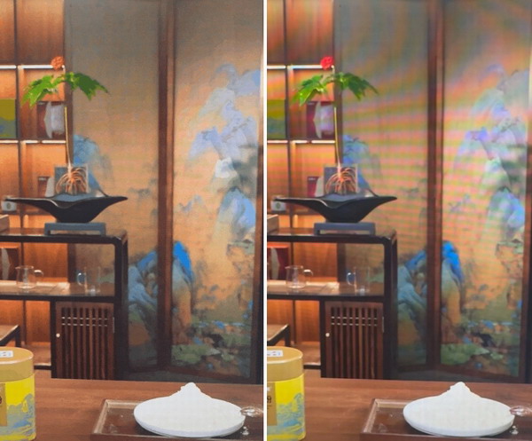 (左)白墻/吸光布的單一直播場景,(右)噴繪和墻紙反光嚴重