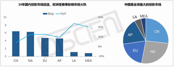 2024年全球投影出貨在夏季賽事效應、中國國補政策、以及年底北美搶出貨效應的拉動下延續了增長勢頭。據DISCIEN(迪顯)統計數據,2024全球投影出貨量24M,同比增長10%。其中,Q4 出貨同比顯著高于往年同期,增幅達 20%。主要源自特朗普 11月當選總統,市場基于貿易戰卷土重來的提前應對,又考慮到年初的春節影響出口效率,在年底出現了“搶出口”的現象。