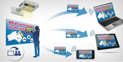 無線投影功能 插入選配無線網(wǎng)卡ELPAP10即可實現(xiàn)無Wi-Fi 網(wǎng)絡(luò)環(huán)境下的無線投影。在有Wi-Fi網(wǎng)絡(luò)環(huán)境下,通過愛普生免費(fèi)軟件EasyMP Multi PCProjection及免費(fèi)手機(jī)APP iProjection即可輕松實現(xiàn)無線連接。讓學(xué)生作業(yè)分享擺脫線纜束縛,教師活動空間可擴(kuò)大到整間教室。 * EasyMP Multi PC projection2.0 及以上版本軟件適用于Windows/Mac 系統(tǒng)電腦。iProjection 2.1 及以上版本應(yīng)用軟件適用于iOS 系統(tǒng)智能手機(jī)和平板電腦。