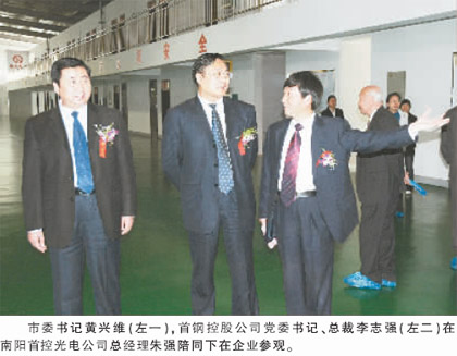 | 市委書記黃興維、首鋼控股公司黨委書記、總裁李志強(qiáng)共同為首控光電有限公司成立揭牌 |
