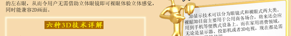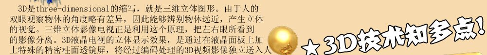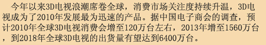 采用主動快門式3D技術的液晶電視屏幕刷新頻率必須達到120Hz以上,即讓左、右眼接收到60Hz以上的圖像,才能保證用戶看到連續而不閃爍的3D圖像效果。