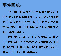 常言道:越大越好。對于液晶顯示器這樣的產品,越大通常意味著更能抓住客戶的注意力。但是作為100英寸液晶顯示器更接近成為大規模生產