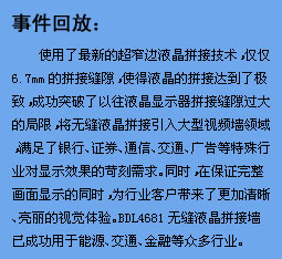 BDL4681的最大亮點,在于其內置有先進的Matrix“軟拼接矩陣”,成為中小型電視墻工程最優的方案選擇。飛利浦BDL4681無縫液晶拼接墻已成功應用于能源等行業。