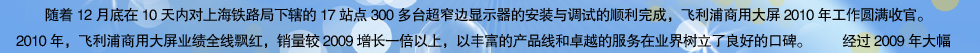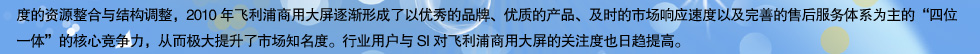 2011年,飛利浦商用大屏將在原有的標準、增值和超窄邊三個系列的產品線的基礎上,再新增LED和電子白板兩個系列的產品線,屆時,飛利浦將擁有20款以上不同的型號,滿足不同行業客戶不同的應用需求。而在增值軟件和系統集成業務的整合和規劃方面, 2011年亦會有不同以往的重大舉措,特別是在大型公共設施建設項目中,飛利浦商用大屏將會加大對液晶拼接領域的投入力度,在液晶的顯示效果、綜合成本、產品穩定性、安裝與后期維護的便利性方面增創新優勢,更好的服務國計民生。