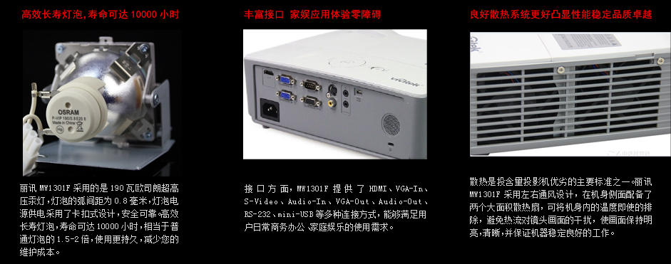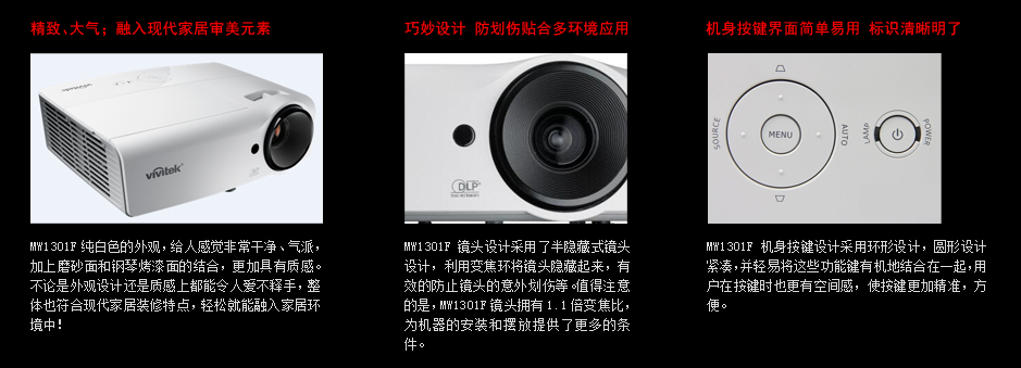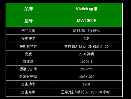 | 近幾年,隨著用戶需求的差異化,商教與家用投影機(jī)產(chǎn)品差異較大,針對(duì)用戶性很強(qiáng),基本上都是在各自的領(lǐng)域應(yīng)用。但,Vivitek麗訊MW1301F整合家用及商教用戶特點(diǎn),支持3D,最先進(jìn)色彩處理技術(shù),完全滿足一般家庭用戶需求;10000小時(shí)長(zhǎng)壽命/隨開(kāi)隨關(guān)以及精簡(jiǎn)大方的外觀設(shè)計(jì),均符合家用、商務(wù)應(yīng)用。不論是性能、還是外觀,以及使用細(xì)節(jié)都能成為家用、商務(wù)應(yīng)用不錯(cuò)的選擇。 |