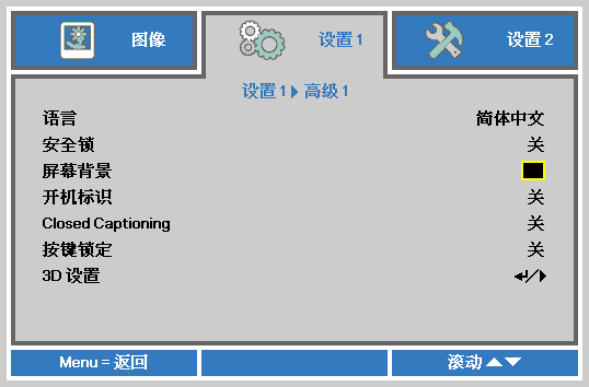 | 如果連接了多個(gè)輸入設(shè)備,按信號(hào)源按鈕和使用▲▼在設(shè)備之間進(jìn)行滾動(dòng)。 | 麗訊Vivitek菜單一向以簡(jiǎn)易、適用為基本原則。作為家用/商教多用途的MW1301F來(lái)說(shuō),菜單設(shè)置要求更要簡(jiǎn)易、實(shí)用,貼合用戶實(shí)際應(yīng)用需求。 | 按菜單按鈕打開(kāi) OSD 菜單。 按 ??移到設(shè)置 1 菜單。 按 ▲▼移到高級(jí) 1 菜單,然后按 Enter 或 ?。 按 ▲▼ 在高級(jí) 1 菜單中向下移動(dòng)至“3D設(shè)置”。 |