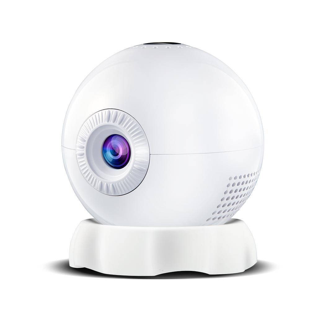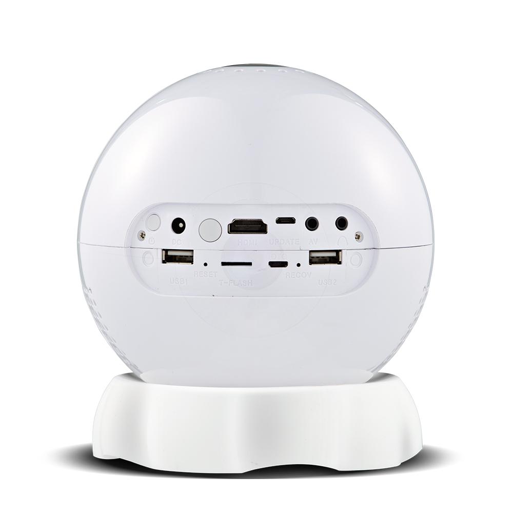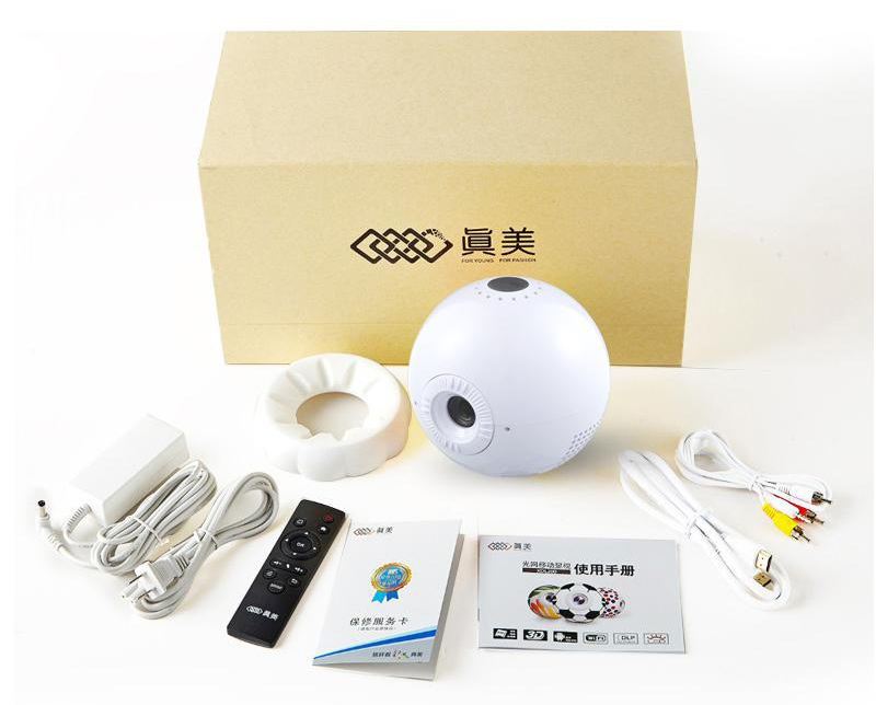 | 純白色調使機身顯得更為精致質感,材質良好不易沾染指紋,直徑只有14.8cm,小巧玲瓏,通過配備的小型底座支撐和固定整個投影機機身,球體設計可以任意旋轉擺放,用戶根據自己的投射環境進行調節,360°盡情的投影,真正做到哪里想看哪里放映。這也是用戶青睞這款產品的原因之一,處處彰顯細節! | Q6機身干凈,無一按鍵。一切操控源于此“神器”,別看體積小巧,但是功能非常齊全,主菜單鍵、3D切換、關機按鈕等應有盡有。手感也非常的不錯,操作簡單,上手快。該“神器”只需兩節七號電池即可。 |