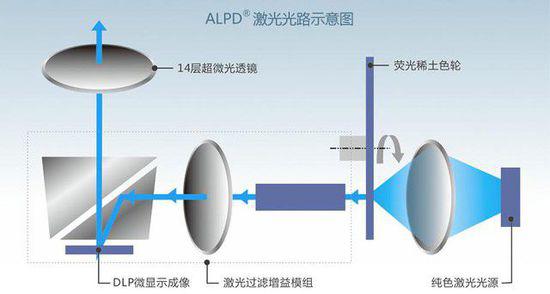 ALPD用基于GaN藍(lán)光激光激發(fā)運(yùn)動(dòng)的熒光材料來產(chǎn)生一種或多種基色用于圖像顯示,是高亮度圖像顯示的最關(guān)鍵核心技術(shù),ALPD的優(yōu)勢(shì)是高亮度、長(zhǎng)壽命、低成本、小尺寸、優(yōu)畫質(zhì)。