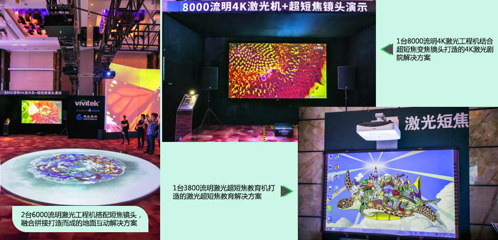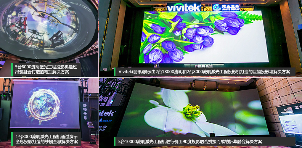 會后,代理商合作伙伴及媒體朋友受邀參觀本次發表新品Vivitek(麗訊)RU98013,以及7組針對不同行業的投影解決方案,會議現場同時展示了多款2017年激光投影機新品及針對多行業應用的不同投影解決方案,更加細分產品覆蓋的行業應用領域。7組解決方案包括:由2臺18000流明激光工程投影機和2臺8000流明激光工程投影機堆疊融合投影而成寬12米高9米巨幅投影墻、由5臺10000流明激光工程機進行側面90度投影,融合拼接而成的折幕融合解決方案、由5臺6000流明激光工程投影機通過吊裝融合打造的穹頂解決方案、由1臺8000流明激光工程機通過演示全息投影打造的紗幔全息解決方案、由2臺6000流明激光工程機搭配短焦鏡頭,融合拼接打造而成的地面互動解決方案、1臺3800流明激光超短焦教育機打造的激光超短焦教育解決方案、1臺8000流明4K激光工程機結合超短焦變焦鏡頭打造的4K激光劇院解決方案。這些震撼精彩的解決方案不僅為本次廣州站展示會增“光”添“彩”,也充分展現了Vivitek(麗訊)投影機的專業水平和穩定品質。